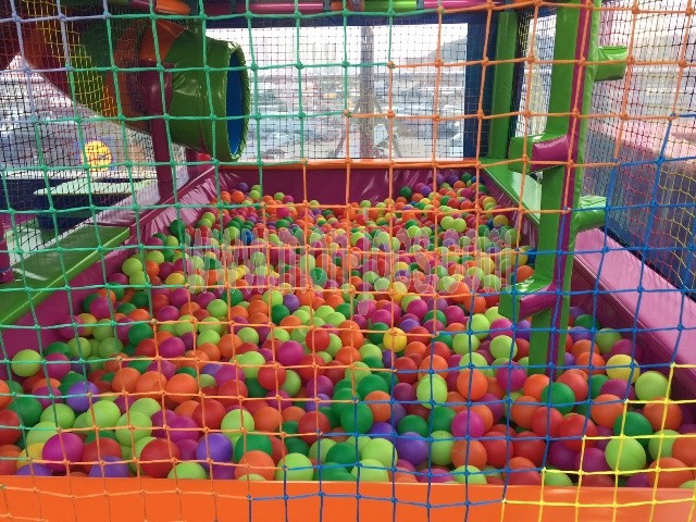 Piscina de bolas, tobogán curvo, tubo de bomberos, escape cáctus, escaleras marinas, 4 quitamiedos, rampa tunel de rodillos, cableski, 6 figuras geométricas o de animales, acolchado con foam de alta resistencia, instalación eléctrica iluminación triple Led´s alta luminosidad, red multicolor, 2 Puertas con cerradura.